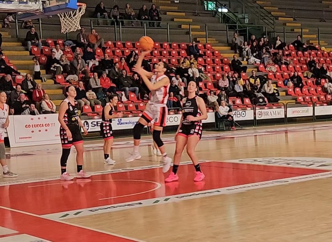 Dopo un tentativo per parte, è Capodagli in avvitamento da sotto la prima a trovare il fondo della retina (2-0). Subito dopo Bona che si fa spazio con disinvoltura sottocanestro (4-0), ma sul ribaltamento Bargiacchi viene dimenticata da sola nel pirturato (4-2). Giangrasso liberata da Maffei nell'angolo sinistro piazza la tripla (7-2), ma Mandroni in terzo tempo trova un passaggio sulla destra nella difesa lucchese, ripetendosi in fotocopia poco dopo con anche il tiro supplementare (7-7). Capodagli uno su due dalla lunetta, Giangrasso in arresto e tiro dalla media (10-7). Ancora Mandroni in terzo tempo fa chiamare il minuto a coach Pistolesi, ma è Montiani a sbloccarsi per il primo vantaggio ospite (10-11). Capodagli da sotto e Bona in avvitamento per il nuovo vantaggio casa (14-11), ma la tripla di Salvestrini impatta nuovamente (14-14). Mandroni ancora in penetrazione, stavolta da sinistra sulla sirena dei 24 (14-16), chiude il quarto Geremei con l'uno su due ai liberi (15-16).Si riparte con Capodagli su assist di Ceccarini (17-16), ma Mandroni con il solito terzo tempo ristabilisce, senza segnare il punto supplementare (17-18). Il giro pieno di Michelotti in lunetta fa rimettere il naso avanti a Lucca (19-18), Skapin su assist di Traorè ribalta ancora (19-20). È Michelotti al quarto minuto a far mettere la freccia a Lucca con due jump dalla lunetta in 20 secondi (23-20), poi lanciando Dianda dopo aver recuperato un pallone di forza (25-20). Time out ospite, è però Capodagli i dribling nel pitturato a far allungare ancora Lucca (27-20), seguita da Morettini con un elegante gioco di prestigio da sotto (29-20). Mascia dai liberi per cercare di fermare l'emorragia (29-22), Bona risponde da sotto su rimbalzo in una selva di mani (31-22). Le ospiti cercano di restare aggrappate alla partita con la tripla di Mandroni e i due di Salvestrini (31-27), con cui si chiude il tempo.Nico riparte a zona, ma il canestro immediato di Maffei in arresto e tiro assistita da Capodagli (33-27) scombina i piani. La tripla di Michelotti da sinistra su assist di Maffei e Capodagli da sotto portano il vantaggio Lucca in doppia cifra (38-27). Ancora Capodagli in passo d'incrocio da sotto (40-27), poi dall'angolo destro Giangrasso su assist di Michelotti si attacca alla giugulare della partita (43-27). Bona da sotto fa quello che vuole, Michelotti in arresto e tiro per il +20 (47-27). Fa muovere appena il tabellone Skapin con l'uno su due ai liberi (47-28), Capodagli in terzo tempo su palla recuperata (49-28). Non è finita la tempesta, siamo appena al sesto minuto segnano ancora Maffei piegandosi sulla destra (51-28), Capodagli appoggiandosi al tabellone e da oltre l'arco su assist di Papa (56-28) e Giangrasso dall'angolo sinistro su assist di Michelotti (59-28).Mascia con tiro supplementare apre l'ultimo quarto (59-31), segue Capodagli con il "cameriere" nel traffico del pitturato (61-31), poi Giangrasso risolve una mischia dai 6,75 (64-31) e subito dopo arriva al tabellone in contropiede (66-31). Salvestrini in arresto e tiro (66-33), dall'altra parte Capodagli in jump (68-33) poi due liberi per Federighi (68-35). Ancora Capodagli da sotto nonostante l'affollamento (70-35) poi la veronica di Dianda (72-35). Esordio in serie B al settimo per Anna Cinquemani. Ancora Mascia dalla media per Nico poi un libero di Traorè (72-38), chiudono Capodagli in penetrazione e Papa su assist di Cinquemani a rientrare dal fondo (76-38).
