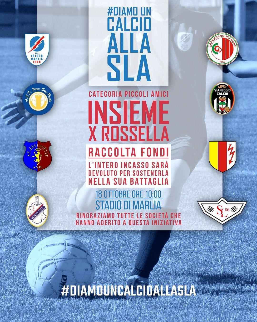 Sabato 18 ottobre, allo Stadio di Marlia, si terrà un evento benefico straordinario, "#Diamo un Calcio alla SLA", dedicato a sostenere Rossella, una giovane affetta da SLA, nella sua battaglia contro la malattia. Il torneo, categoria Piccoli Amici, vedrà protagoniste le squadre di calcio Folgor Marlia, Luccasette, Capezzano, Pieve San Paolo, Montecarlo, Folgore Segromigno, Viareggio e Sporting Lucca, unite per una nobile causa.