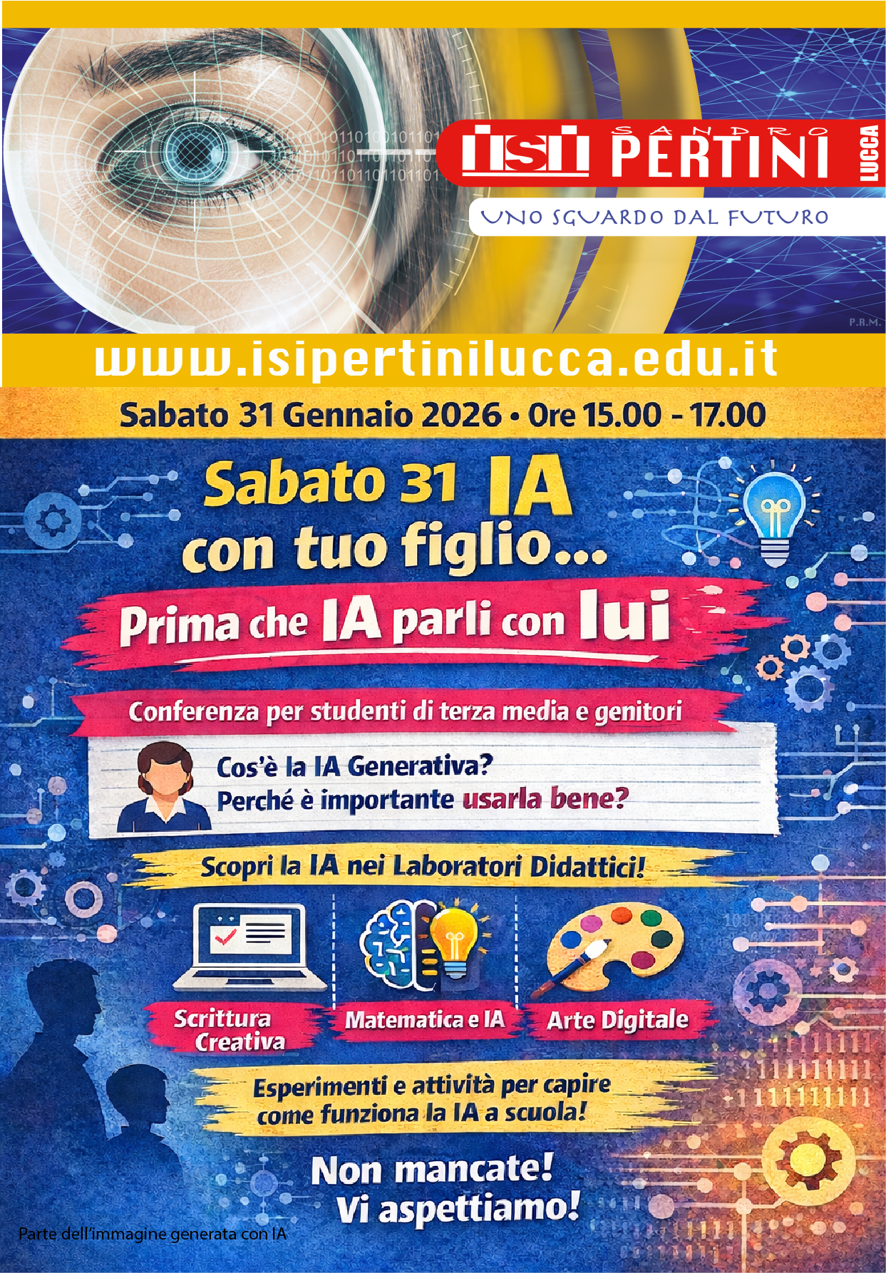 Sabato 31 gennaio dalle ore 15 alle ore 17 si svolgerà presso la sede centrale dell'ISI Pertini in Viale Cavour 267 una conferenza divulgatoria sul tema dell'uso della AI nella scuoa dal titolo "Parla di IA con tuo figlio, prima che l’IA parli con lui" Un incontro per studenti, genitori e insegnanti delle classi terze della scuola secondaria di primo grado e per le loro famiglie e famiglie degli studenti dell’ISI Pertini.