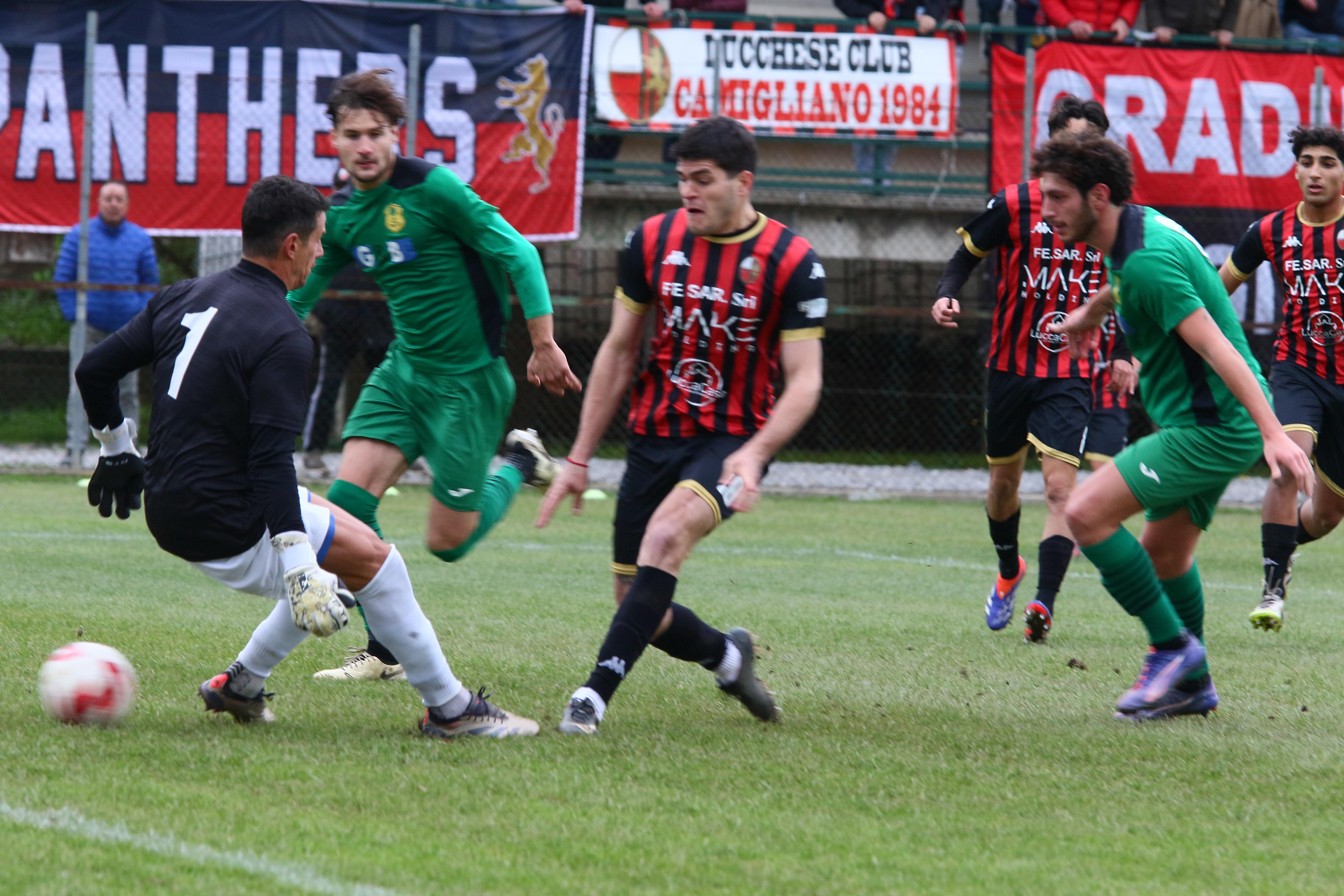 Una bella Lucchese batte 2-1 il Montespertoli grazie ai gol di Camilli e Piazze nella ripresa, sfiora più volte il tris e mantiene inalterato il vantaggio sulla Zenith Prato: a quattro giornate dalla fine sono sempre otto i punti di vantaggio. Commento, tabellino e foto