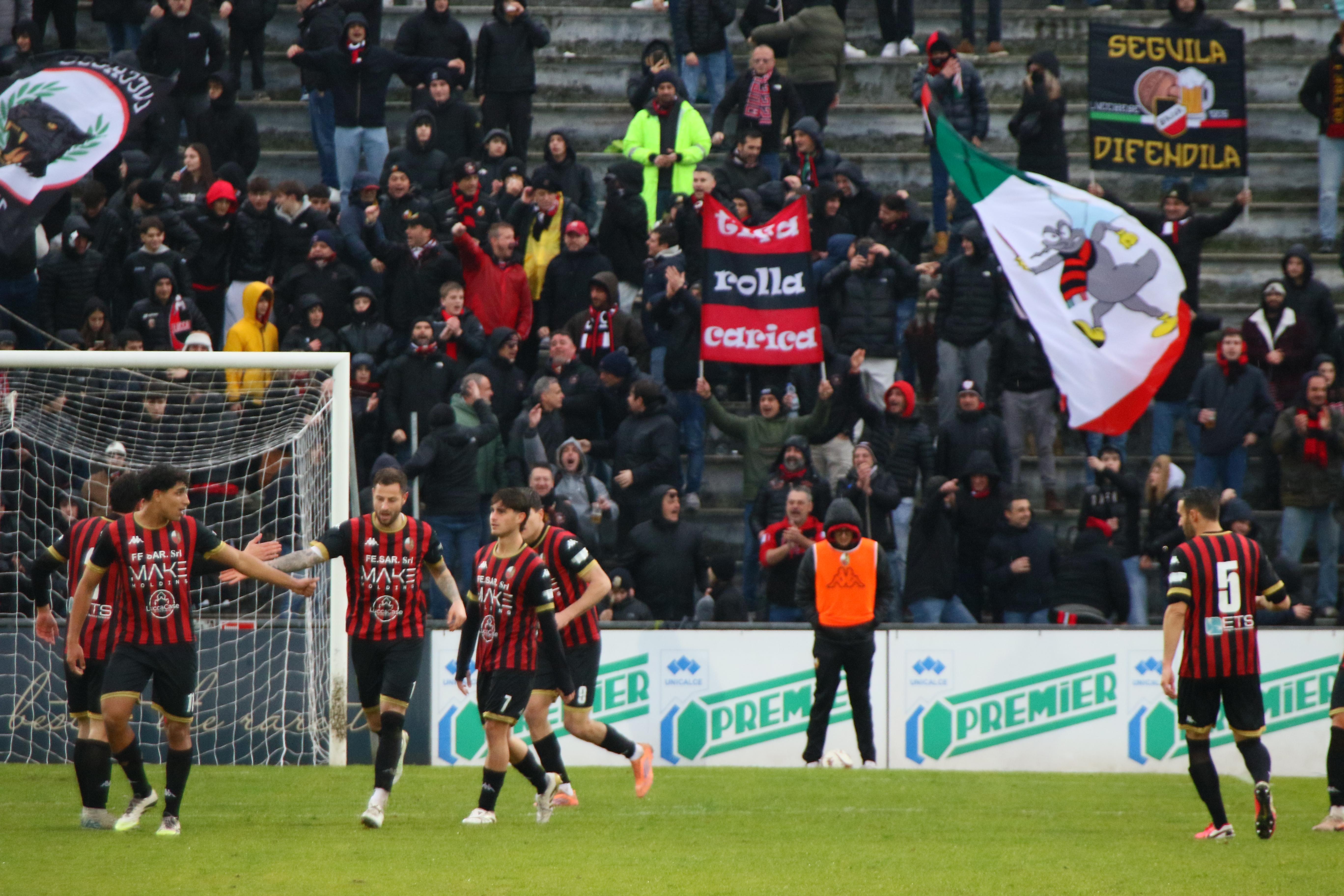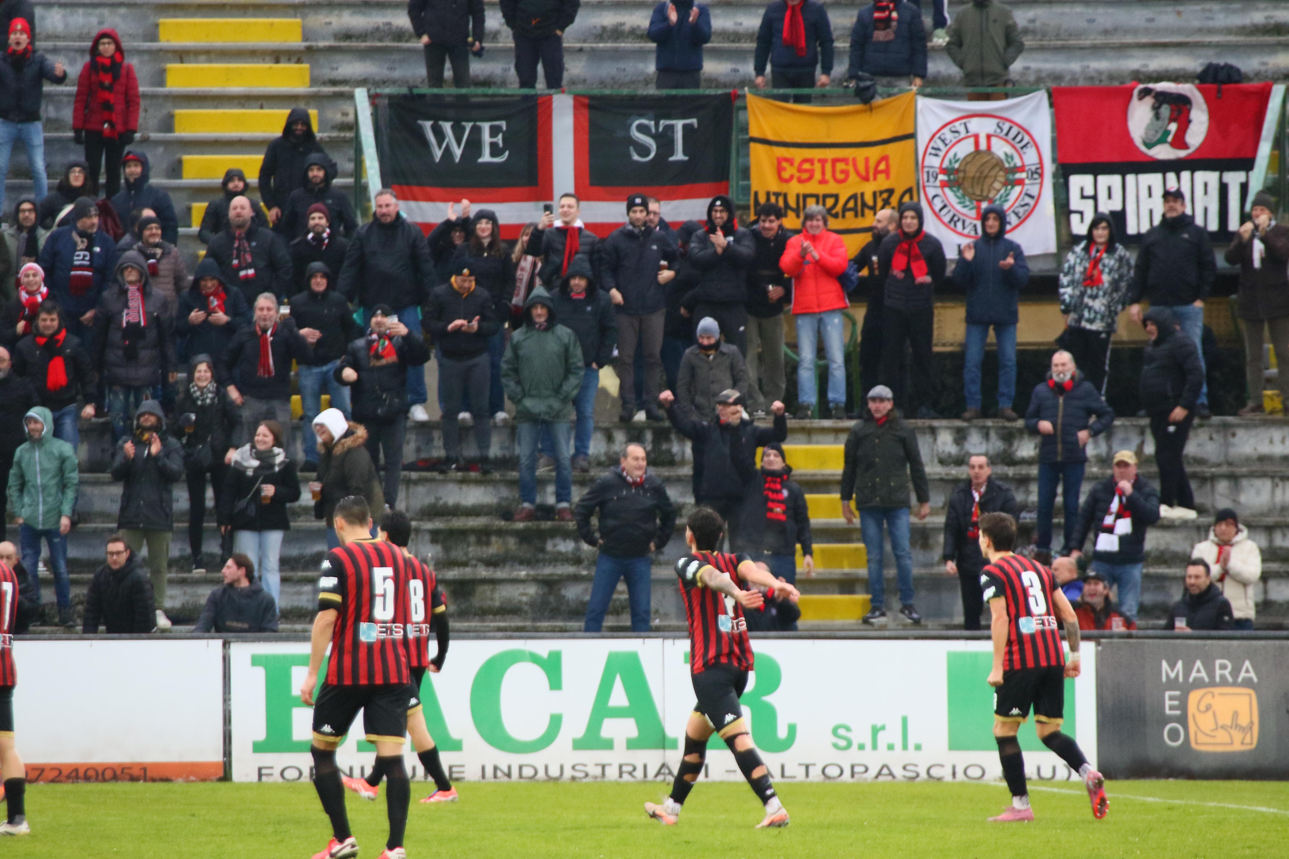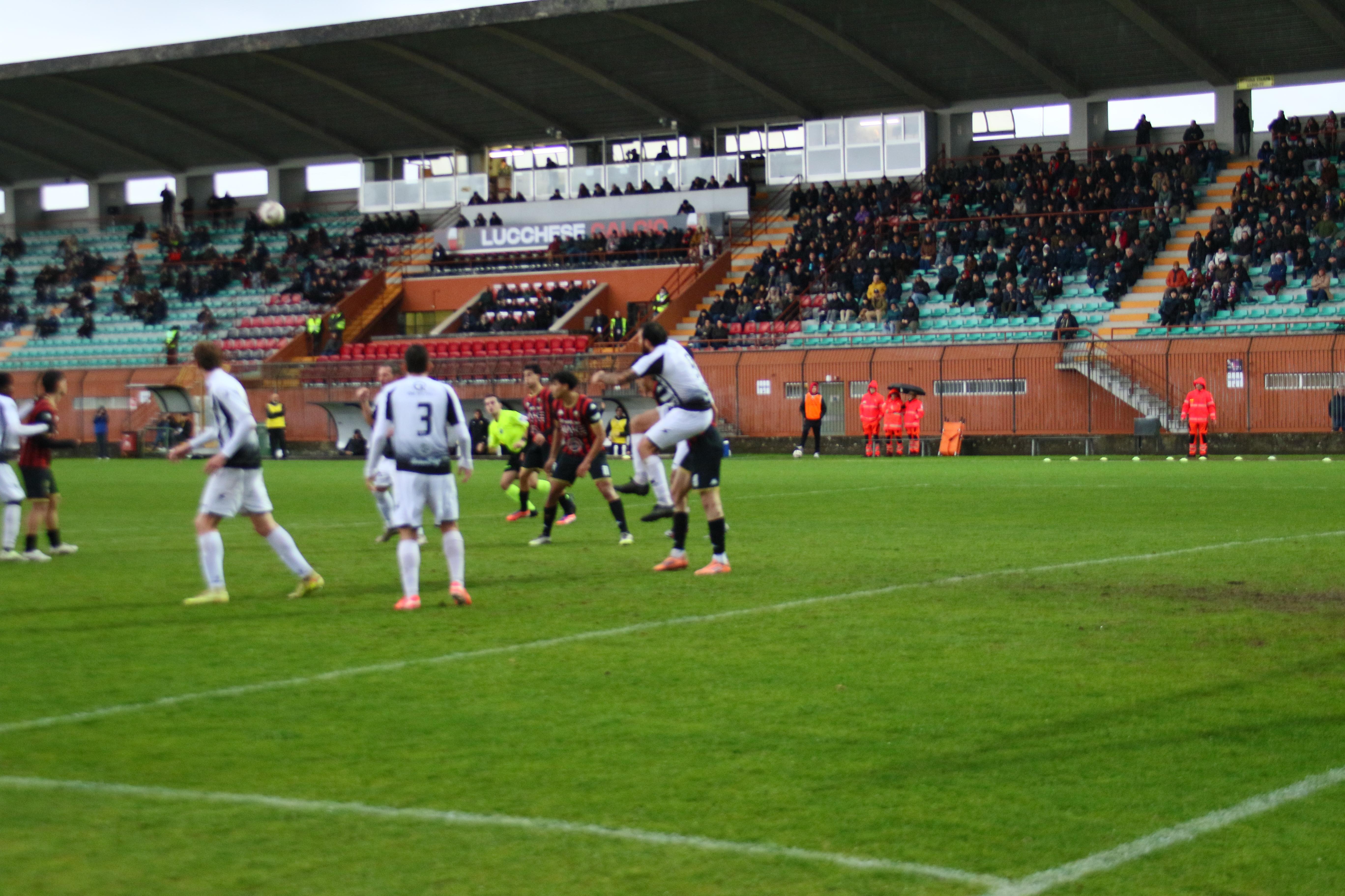Ma i bianconeri stringono di assedio la Lucchese: una mischia furiosa prima e poi una parata di Milan su Galligani quando siamo al 42'. E' un parapiglia in campo con Galligani che vergognosamente non restituisce un pallone con l'inganno provando a beffare la difesa rossonera. Le lancette scorrono, l'arbitro concede addirittura nove minuti di recupero. Al terzo dei quali Pegollo centra una traversa in sospetto fuorigioco. E' un assedio in un clima rovente. Ma gli sforzi degli ospiti si infrangono sulla ferocia difensiva dei rossoneri. E' una vittoria pesantissima. Che regala il primo posto in solitudine.