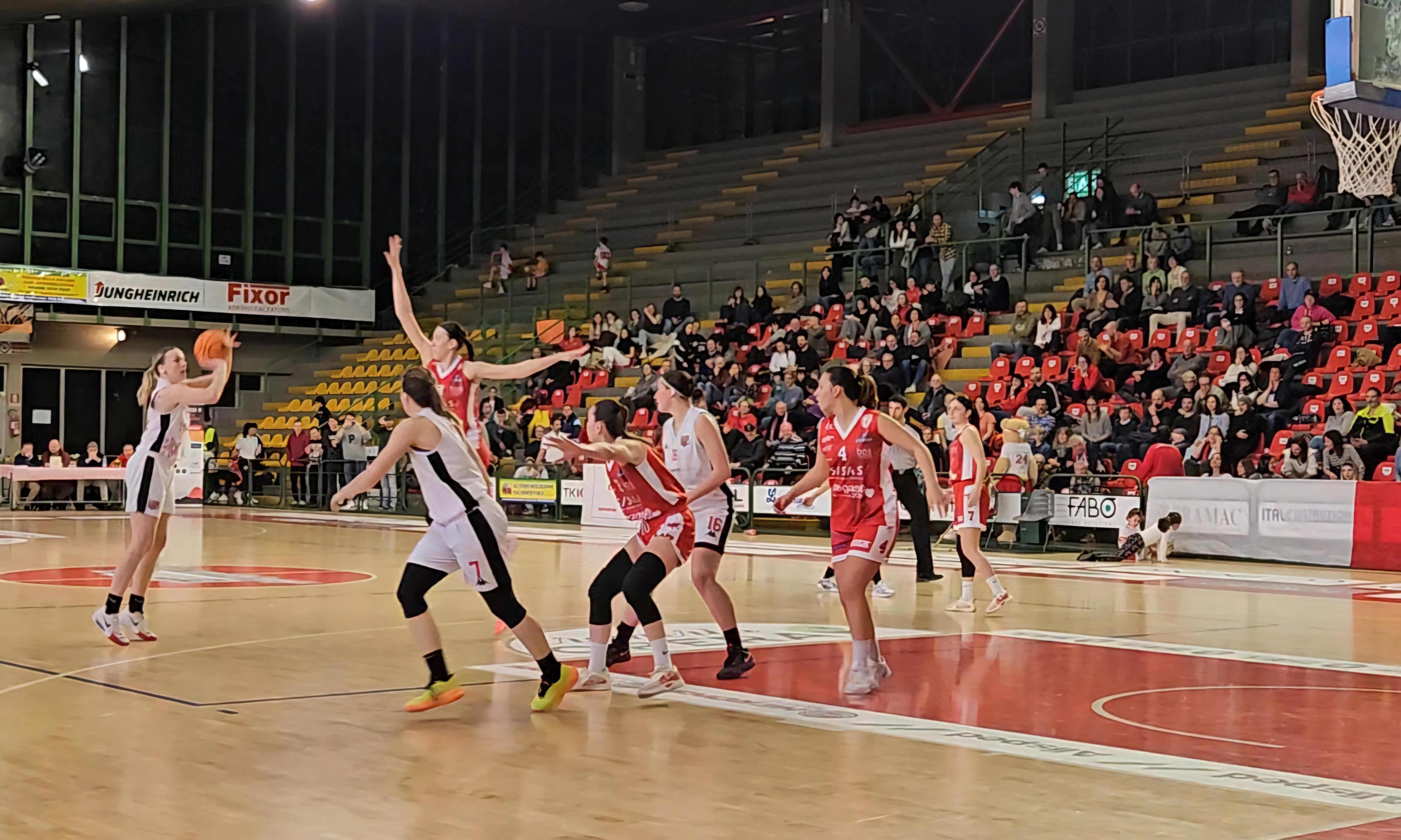 Primo quarto, dopo vari tentativi falliti da ambo le parti mette i primi tre punti a referto Falkowska al terzo minuto. Azione successiva, Maffei risponde ancora da tre dopo un rimbalzo in attacco di Valentino (3-3). Dopo i due punti di Soli, si slocca anche Paulsson su assist di Tessaro (5-5). Dopo il 2/2 dalla lunetta di Paulsson, Tessaro da tre su assist di Paulsson (10-5), ancora Paulsson e Olajide da oltre l'arco (13-8). Olajide e Scarpato da tre fissano il quarto sul 13 pari.Apre la seconda frazione Paulsson da oltre i 6,75 assistita sulla prima azione da Michelotti, subito replicata di Scarpato (16-16). Un libero a testa per Maffei e Gambelunghe, poi Manganello dall'angolo (17-20). Michelotti lascia Soli sul posto e penetra in area per il 19-20. Gambelunghe dalla media, poi Michelotti che ruba palla e lancia Chiti (21-22). Al quarto minuto i cinque punti di Gambelunghe fanno chiamare il minuto di sospensione a coach Ferretti (21-27). Ancora Manganello da tre e, dopo un libero di Chiti, altra bomba di Scarpato per il +11 in due minuti (22-33). Ruba palla Michelotti e va a segnare (24-33) con timeout ospite.