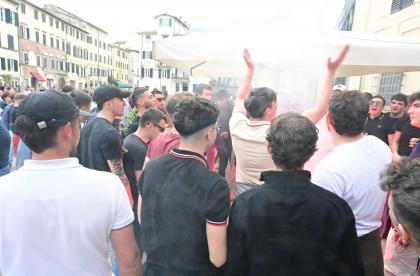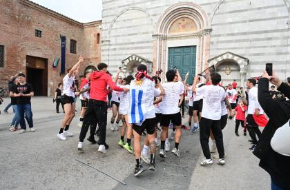 A fine gara, tutta la squadra invade la sala stampa, urlante, esultante, con indosso le magliette celebrative dove non mancano le frecciate a chi riteneva la Lucchese non idonea a lottare per la promozione. E invece hanno avuto ragione loro, mister Pirozzi e tutta la società. Poche parole tanta esultanza sulla scrivania che si solita ospite le dichiarazioni ufficiali.