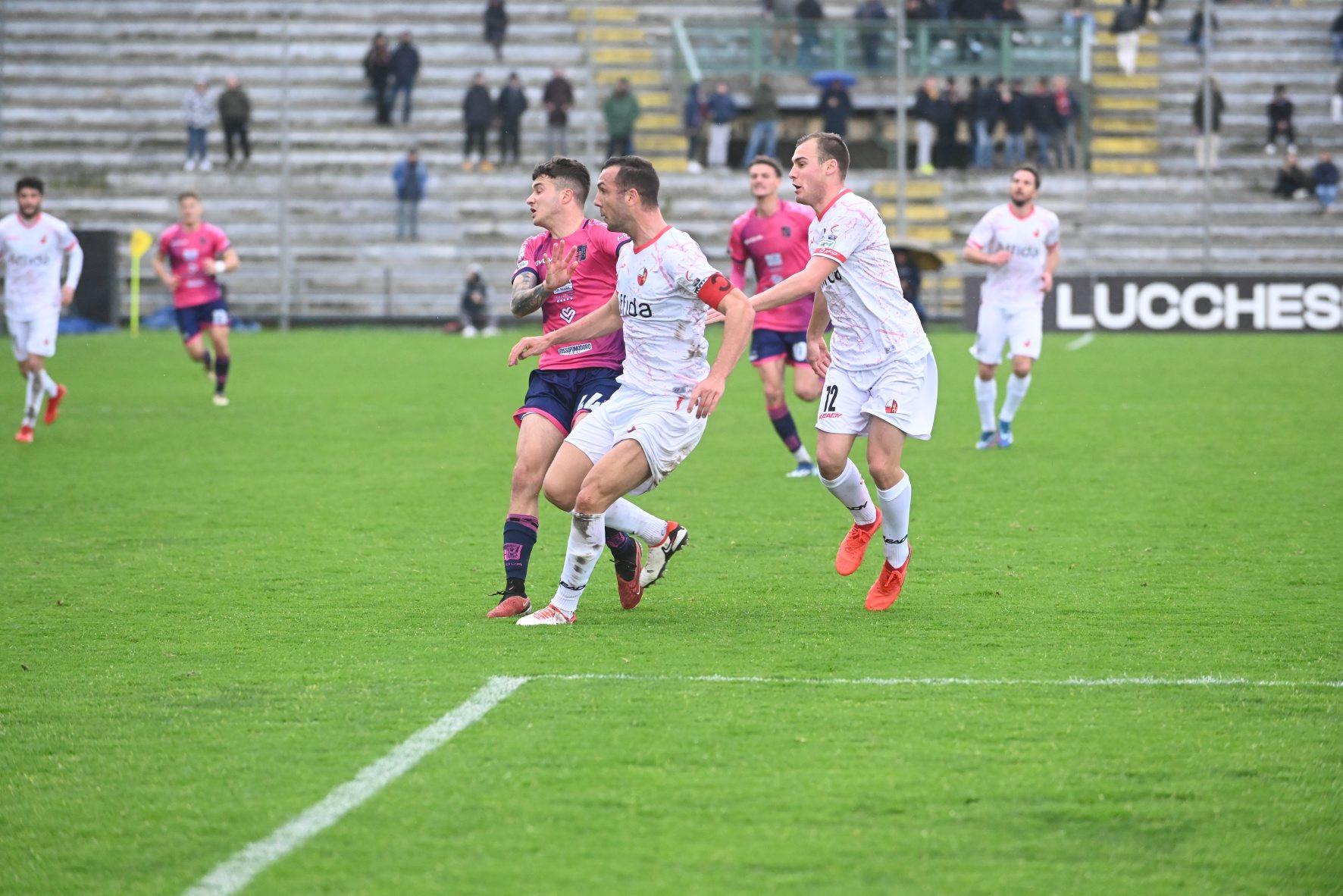 In un Porta Elisa deserto, la Lucchese si impone con qualche brivido finale per 2-1 contro il Rimini. Un successo che mancava dal 3 febbraio scorso contro la Spal. Cambio di modulo per Gorgone che per questa sfida opta per il 4-3-3. Le novità rispetto alla sfida di Padova sono Yeboah, Guadagni e Gucher, schierato dopo diversi mesi nel ruolo di regista. Dopo pochi secondi, è proprio l'austriaco a sfiorare il gol dalla distanza, a Colombi già battuto. Prima frazione di personalità della Lucchese, la quale gioca con più intensità e tranquillità: basti pensare al dribbling rischioso di Chiorra ai danni di Morra. Al 5', primo squillo anche dei biancorossi con Sala che per pochi centimetri fallisce la deviazione vincente. Tre minuti più tardi, Guadagni sfiora la magia in acrobazia, con la palla che finisce di pochi centimetri sopra la traversa. É solo il preludio di ciò che accadrà al 18', quando su sviluppi di un calcio d'angolo Quirini riesce a battere di testa Colombi. Secondo centro in rossonero per il classe 2003. La Lucchese riesce a tenere il pallino del gioco e al 32' trova il raddoppio con Gucher che, dopo aver recuperato palla sulla trequarti avversaria, infila con un tiro rasoterra l'estremo difensore biancorosso. Nel finale, da sottolineare la reazione degli ospiti che vanno vicini al 2-1, ma Chiorra è reattivo nel deviare con i pugni l'esterno destro di Malagrida.