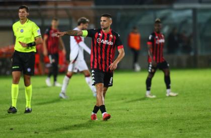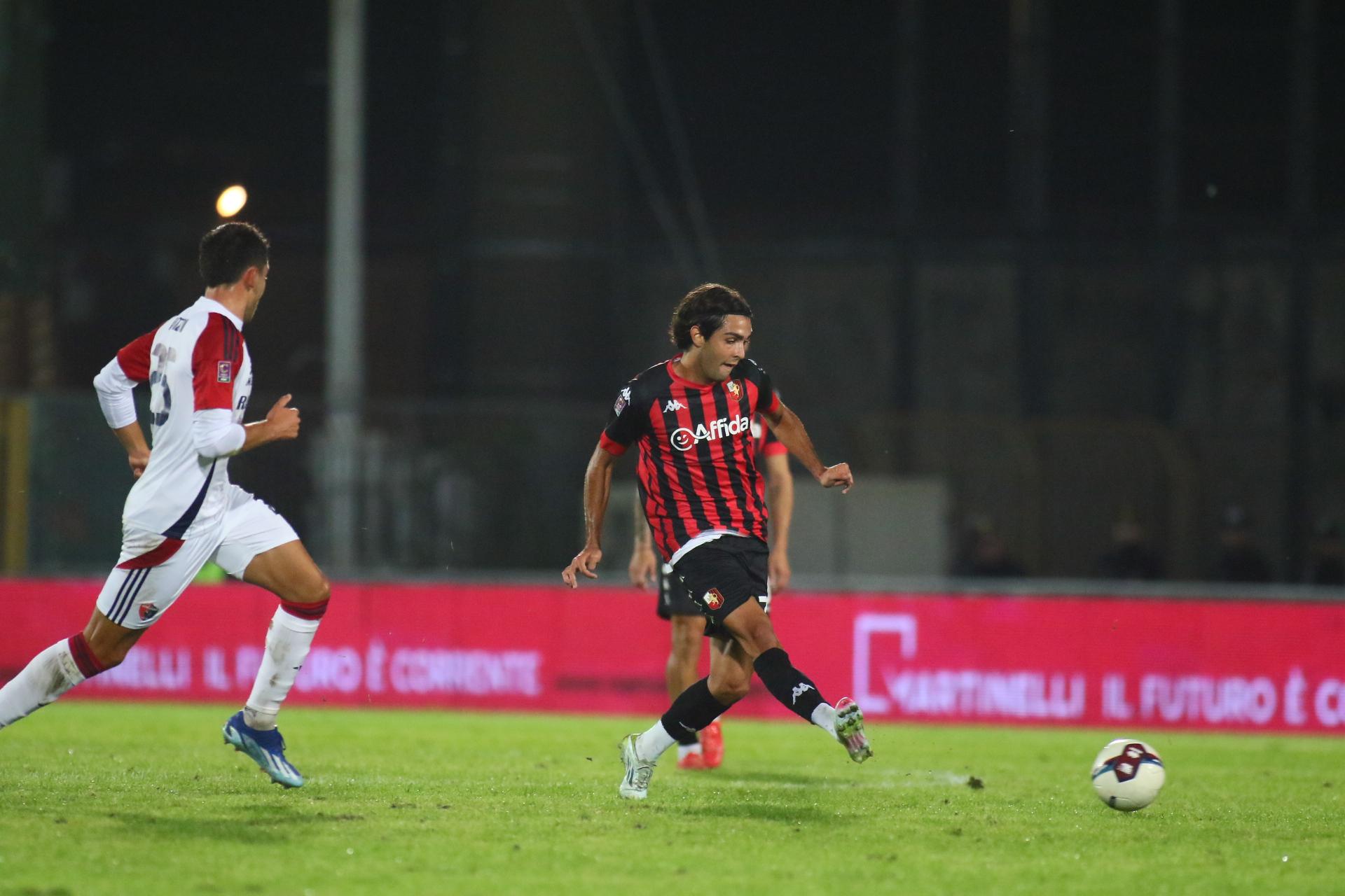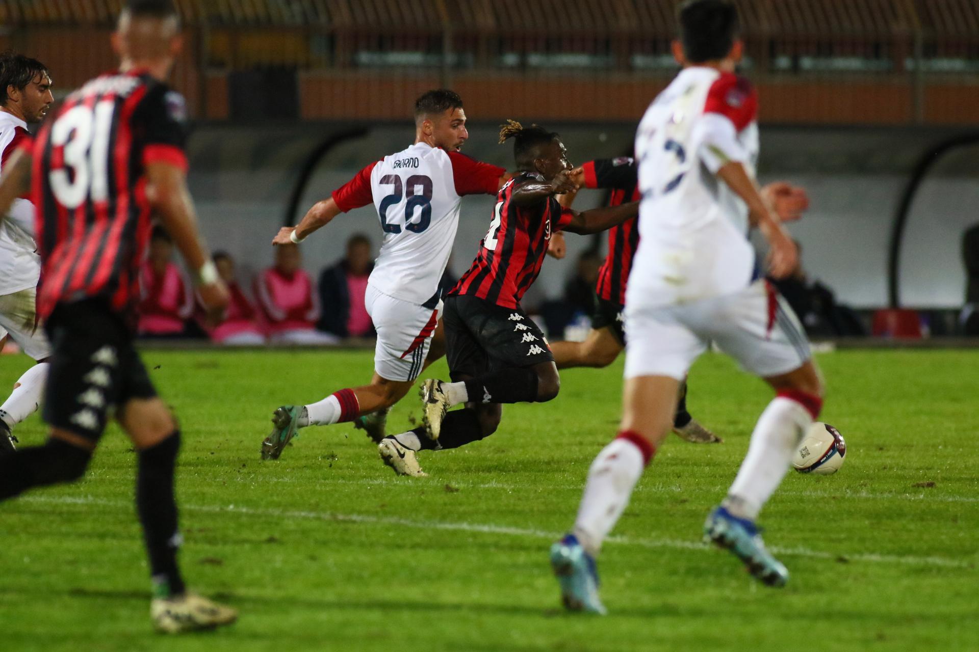 Nel trio difensivo, falcidiato da infortuni e squalifiche, mister Gorgone sceglie Fazzi, Dumbravanu e Frison, riportando sull'esterno Quirini. Dunque difesa nuova di zecca rispetto a Perugia dove la sensazione di fragilità era stata palese. E nel riscaldamento anche Antoni deve dare forfait per un problema al polpaccio: al suo posto Visconti. In attacco, torna Costantino che conta sul supporto di Saporiti. E' proprio quest'ultimo a impegnare due volte in due minuti il portiere ospite: al 3' su punizione, al 5' con un tiro da centroarea. Al 10' Frison rischia la frittata con un controllo errato che favorisce Montebugnoli, alla fine sbrogliano Palmisani e Fazzi. Al 14' episodio molto dubbio in area ligure: Costantino viene visibilmente trattenuto mentre si invola in porta, l'arbitro, l'ennesimo debuttante in C propinato ai rossoneri in questa stagione, fa giocare.