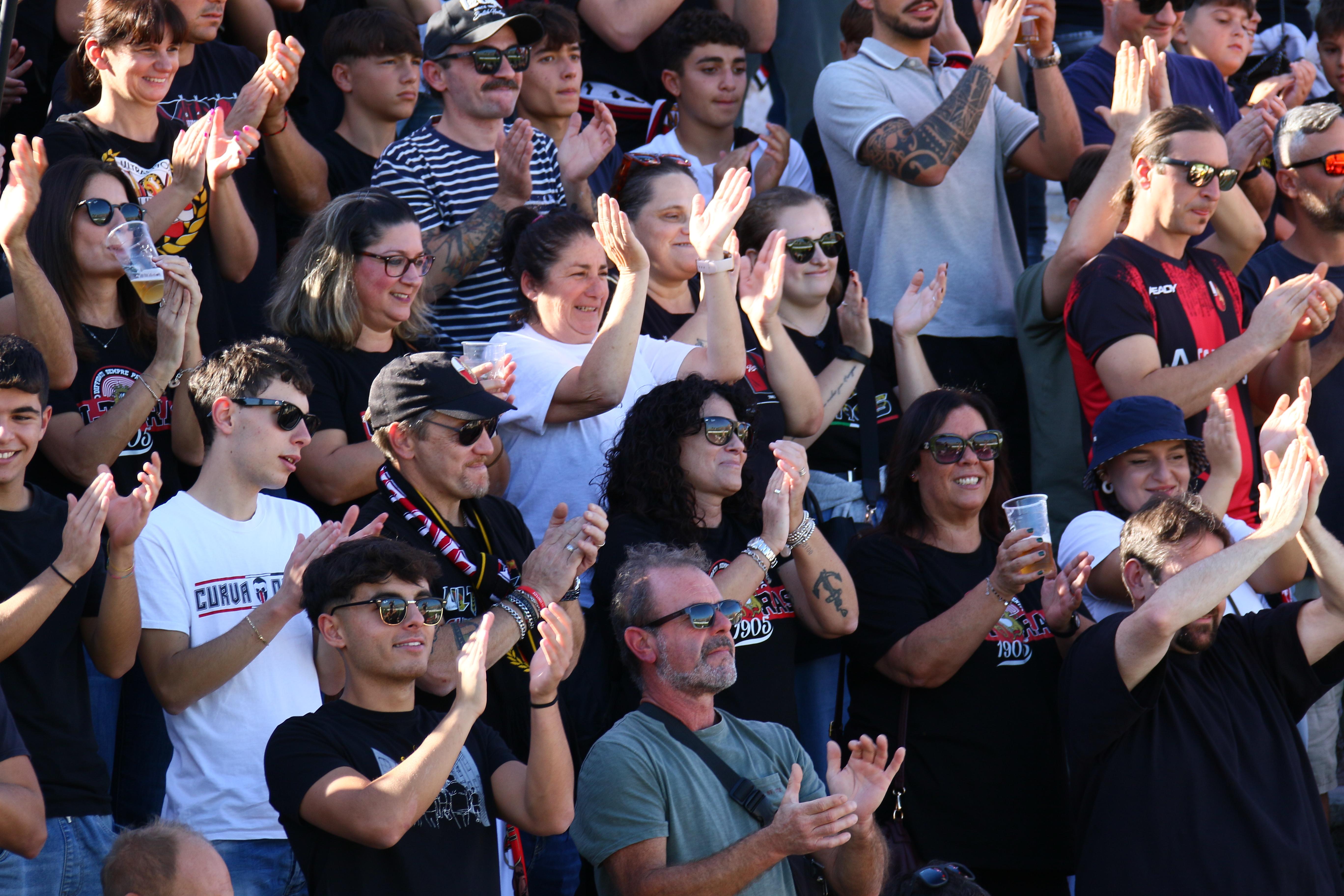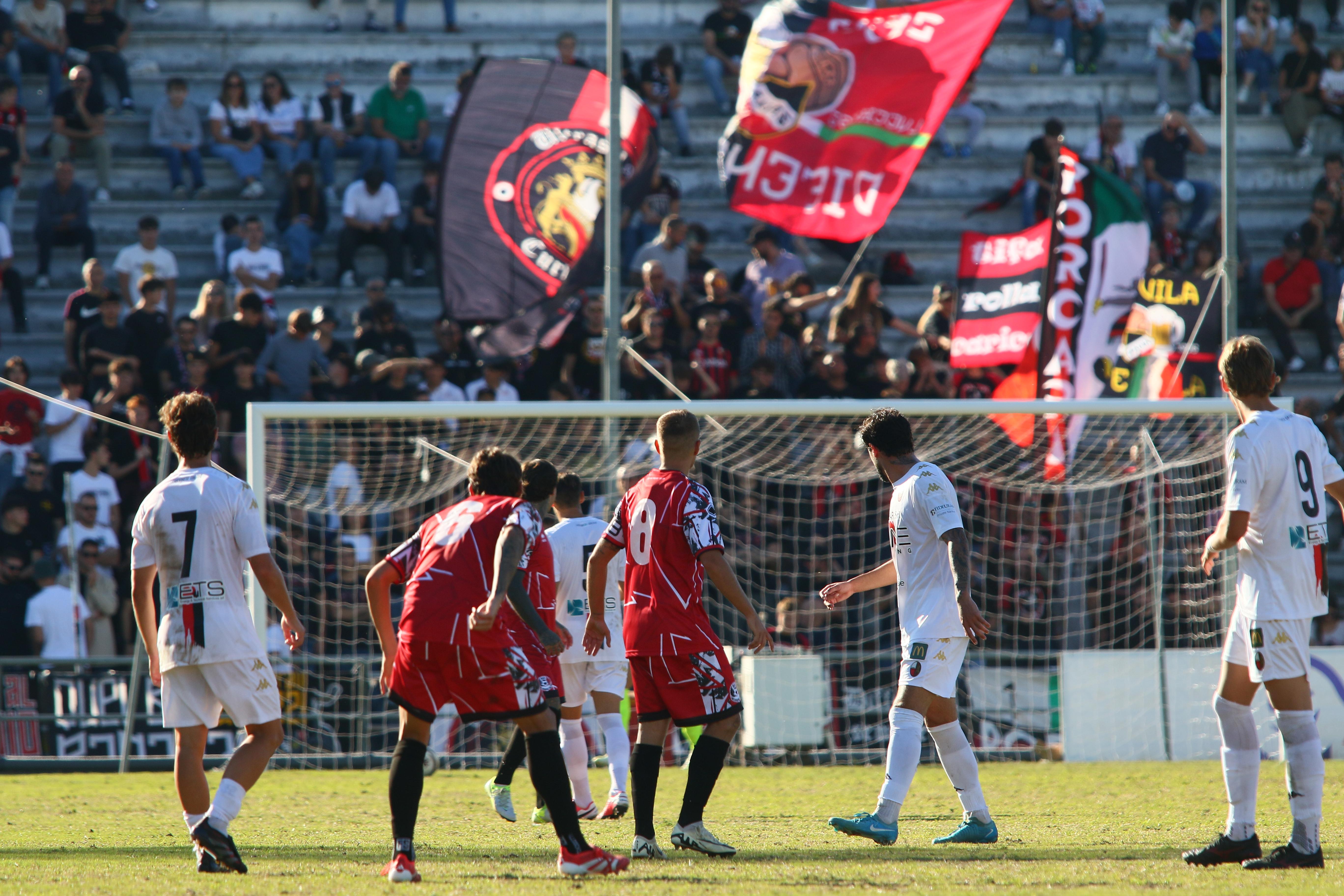 Mister Pirozzi ritrova a centrocampo Picchi e in attacco lancia dal primo minuto Ragghianti, che viene affiancato da Riad e da Caggianese, con Bartolotta arretrato a centrocampo. In difesa, sull'esterno, c'è lo sorpresa Lorenzini. Rispetto a sette giorni fa sono quattro i cambi nella formazione iniziale. I rossoneri, oggi in maglia bianca, partono con una occasione di Bartolotta al 3' ma il portiere ospite è attento. Nei primi minuti la pressione dei padroni di casa è costante. E al 10' porta i suoi frutti: l'azione è insistita, a chiuderla con un gran gol è Lorenzini con un tiro imparabile dal limite.