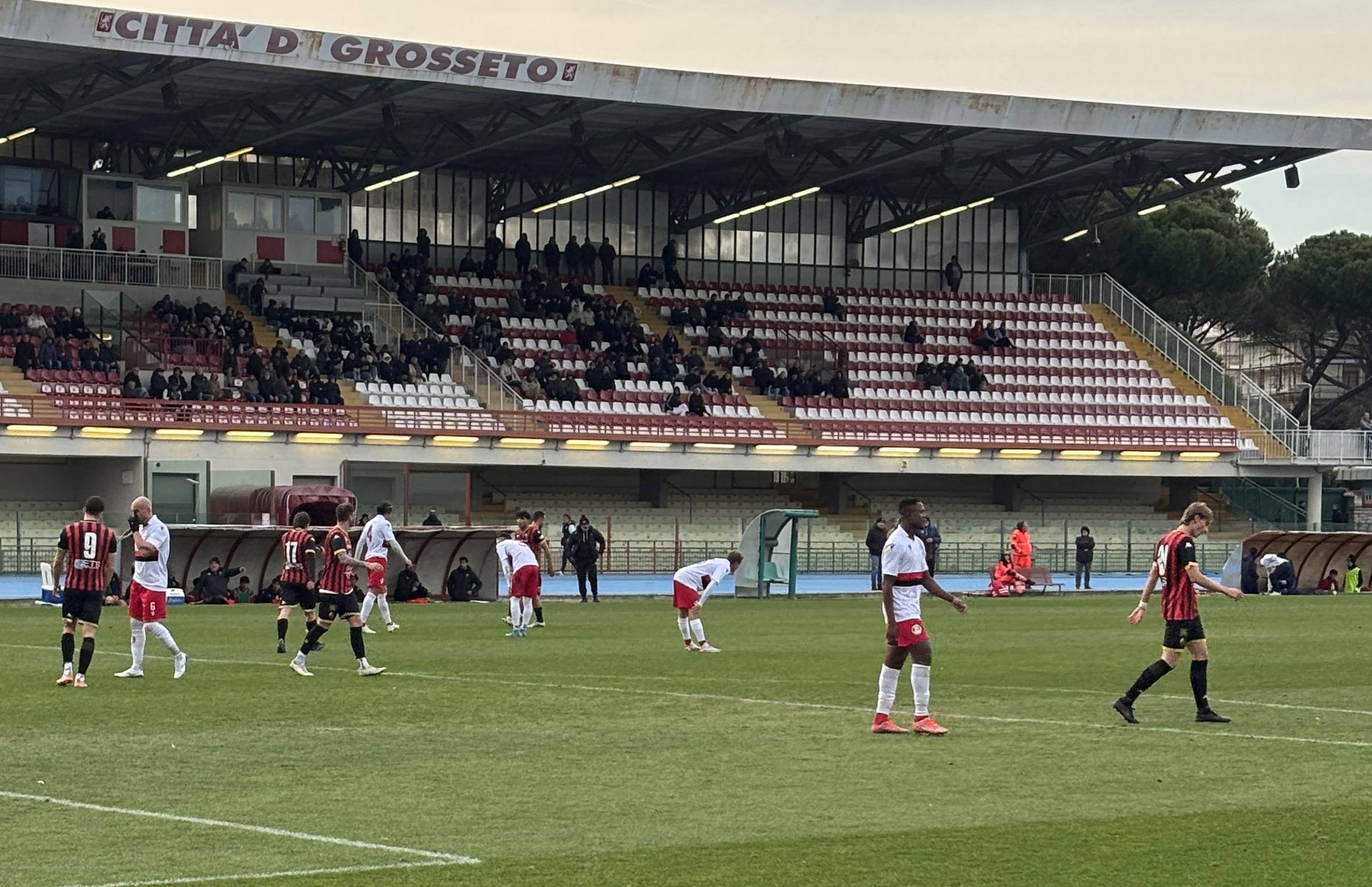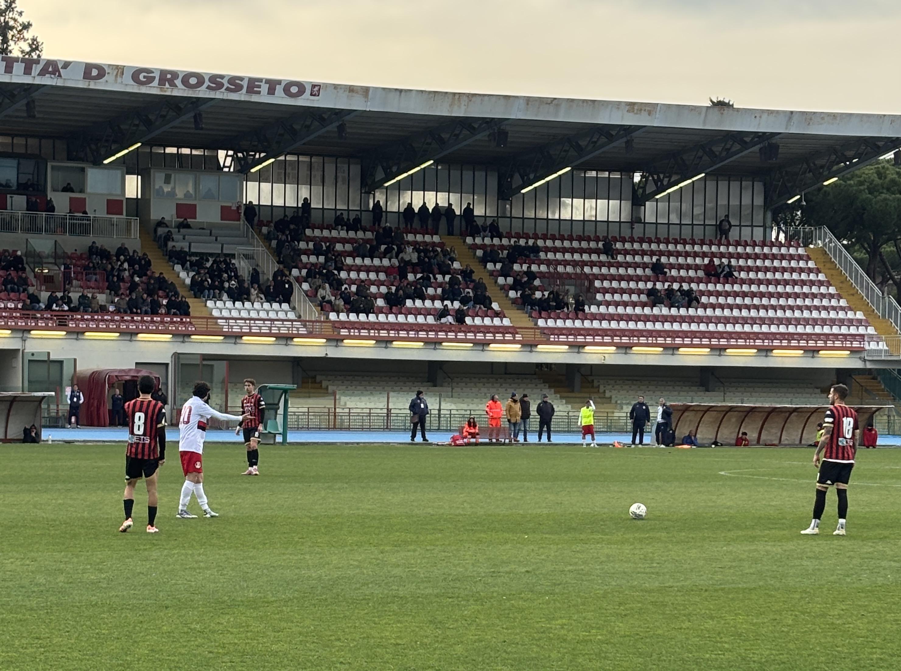 L'avvio è dei padroni di casa che si vedono regalare una punizione dall'arbitro (c'era invece fallo su Santeramo) e sulla conseguente mischia inn area Borboryo cicca il tap in. La Lucchese stenta ad entrare in partita, e al 12' serve il miglior Milan per evitare il vantaggio dei grossetani con Blanchard che calibra un preciso colpo di testa. La risposta è affidata ad un diagonale di Piazze che termina sul fondo tre minuti dopo. Al 24' Lorenzini prova un tiro cross che sorprende Pini: il portiere para con difficoltà sulla linea di porta. Al 28' è Palma a non trovare la coordinazione giusta a due passi dalla porta. Poi più nulla da segnalare se non un predominio sterile dei rossoneri sino al duplice fischio con i padroni di casa che si limita a giocare di rimessa.