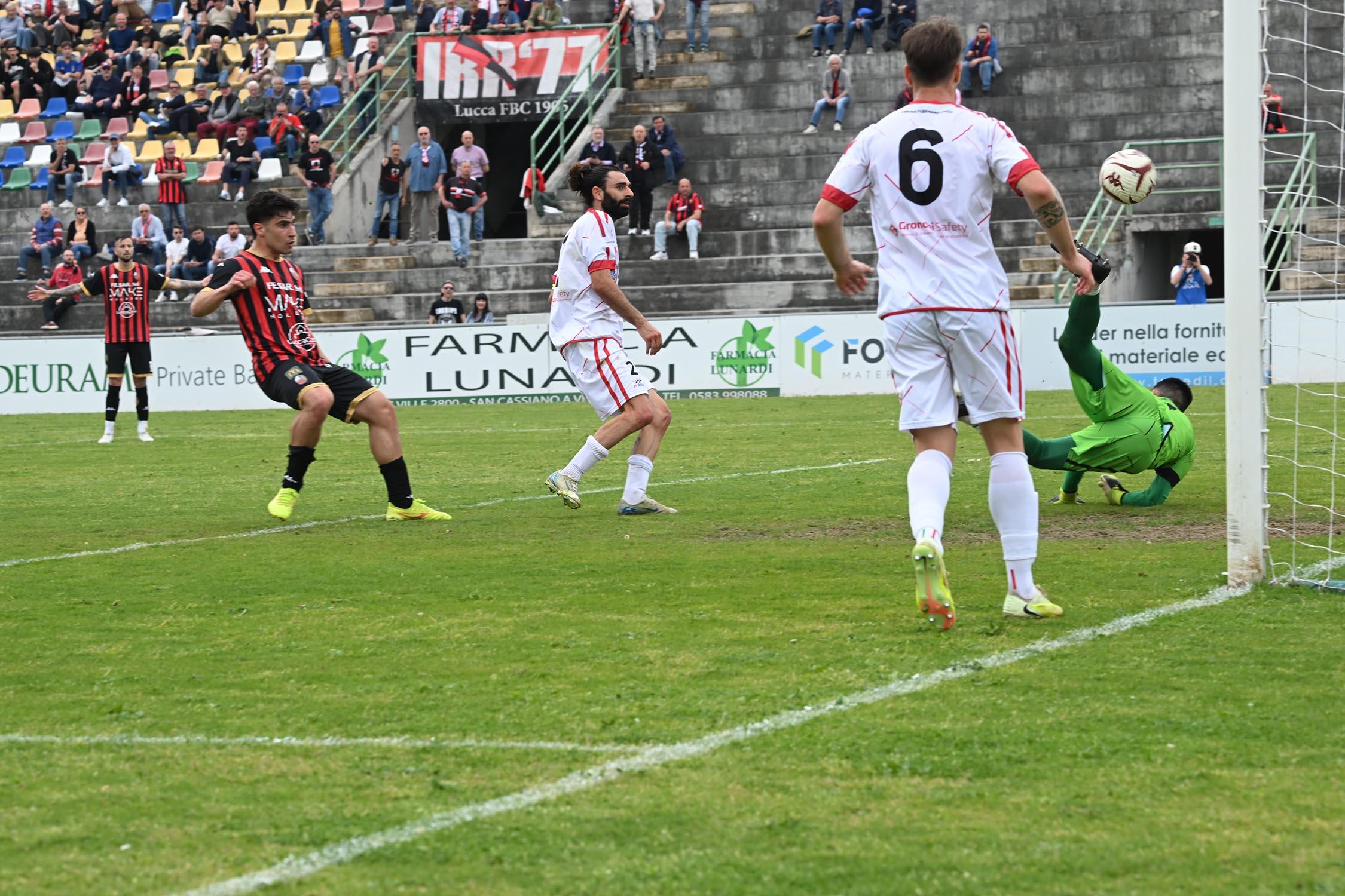 Al 21' Camilli fa tutto da solo e colpisce un clamoroso palo a Rizzato abbondantemente battuto. Non basta: otto minuti dopo sempre Camilli battezza anche l'altro palo della porta al termine di un'azione impostata da Santeramo. Il dominio è davvero assoluto, anche se dalla mezzora la Lucchese tira giusto un po' il fiato. Il vantaggio minimo all'intervallo è davvero stretto.