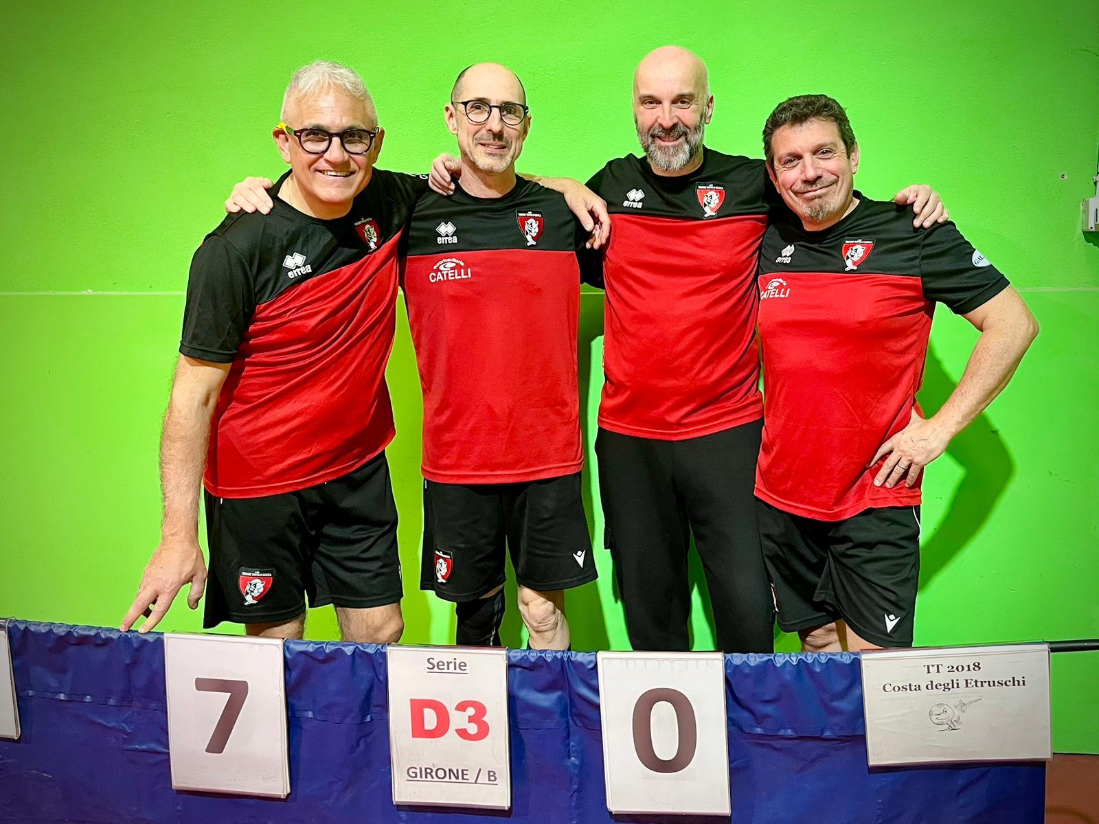Nei campionati regionali, la Serie C2 ha ceduto in trasferta per 5-2 contro i Pulcini Cascina A nonostante la doppietta di Madrigali, mentre la Serie D1/A è stata superata per 4-3 dall’ASD Volterra A, con i punti di Ercolini D. e del doppio Ercolini/Riccomini; di segno opposto la prestazione della Serie D1/B, che ha travolto l'Aics TT Sestese A con un netto 7-0 frutto delle doppiette di Ciacchini, Ragghianti e Ricci, oltre al punto nel doppio Ricci/Ciacchini. Nelle categorie D2, si registra la vittoria interna della squadra A per 5-2 sul TT Forte dei Marmi 2008 C (punti di Mori, Ercolini M. e Stefani) a fronte delle sconfitte esterne subite dai gironi B e C rispettivamente contro Pulcini Cascina (4-3, con marcature di Giuntini e del doppio Giuntini/Naldi) e TT Pistoia A (5-2, doppietta di Viani); la Serie D2/D, pur uscendo sconfitta per 4-3 dal confronto con il Cus Firenze (punti di Abballe e Cotrozzi), mantiene invariata la propria leadership in vetta alla classifica. Il fine settimana agonistico si è chiuso con i successi del settore D3: il gruppo A ha consolidato il primo posto battendo il DLF Viareggio per 5-2 grazie a Casale (2), Barsotti e Caroli, mentre il gruppo B si è imposto con un perentorio 7-0 sul TT Costa degli Etruschi A, firmato dalle doppiette di Donisi, Quattriglia e Del Greco insieme al punto nel doppio Del Greco/Martinucci.